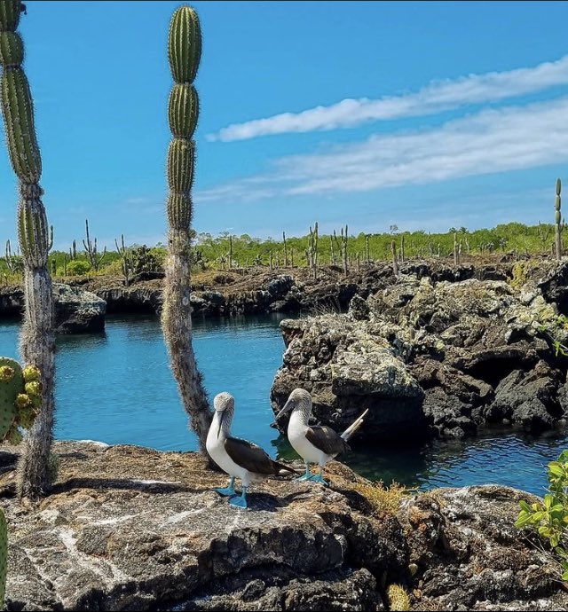 Caminata Túneles por formaciones de roca volcánica y paisajes únicos de lava en Isla Isabela Galápagos. Sendero entre cactus gigantes y zonas de anidación piqueros patas azules. Desde el mirador terrestre se observa fauna marina: tiburones, tortugas, pingüinos en piscinas naturales. Ecoturismo, avistamiento fauna, senderismo Galápagos, túneles lava.